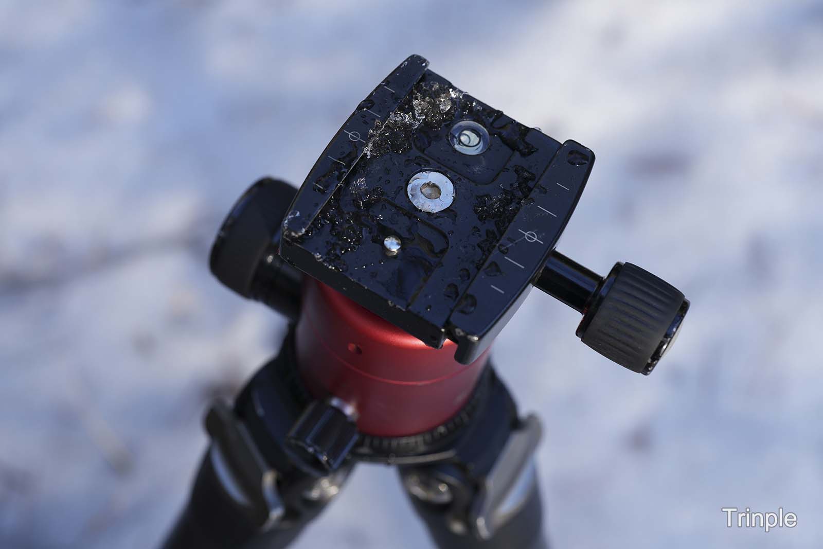 冬の撮影でよくあることですが、プレートやクイックシューについた雪が凍ってしまって噛み合わなくなってしまうことがあります。その場合は、ホッカイロで温めて氷を溶かすと装着できます。そうならないためにも、雪をしっかり払ってからプレートを設置することが大切です。