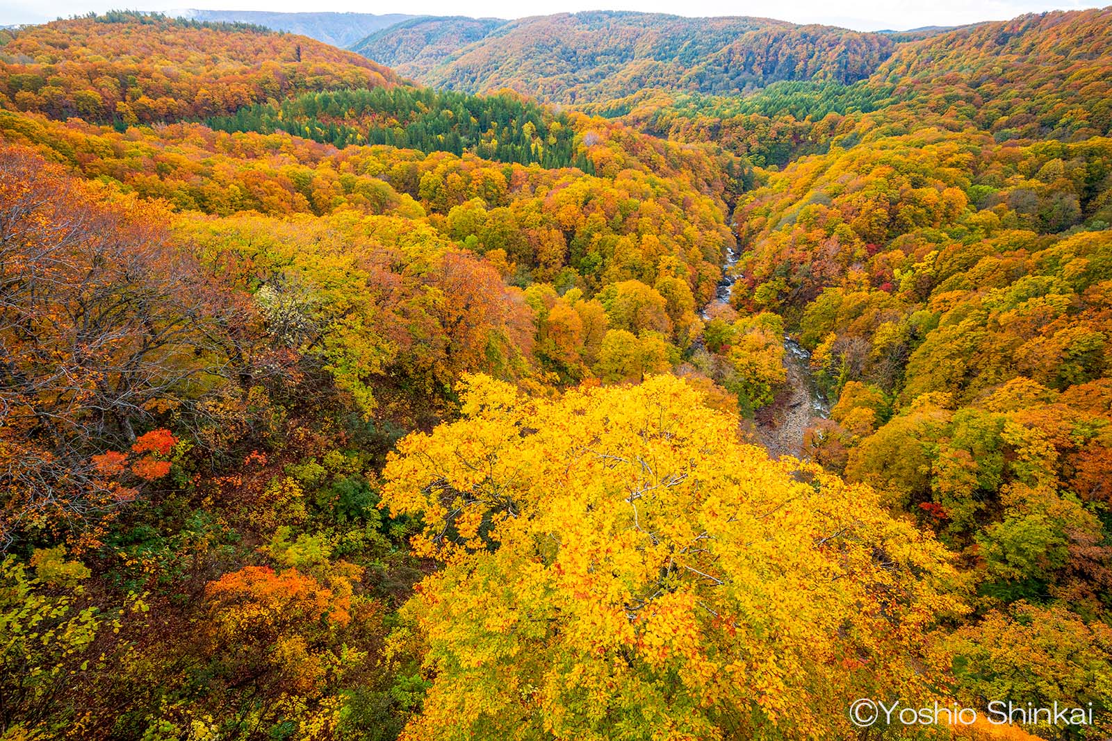 でも、一番手前のブナの色が良かったので橋の欄干からカメラをせり出して画面に入れ込んで撮影。