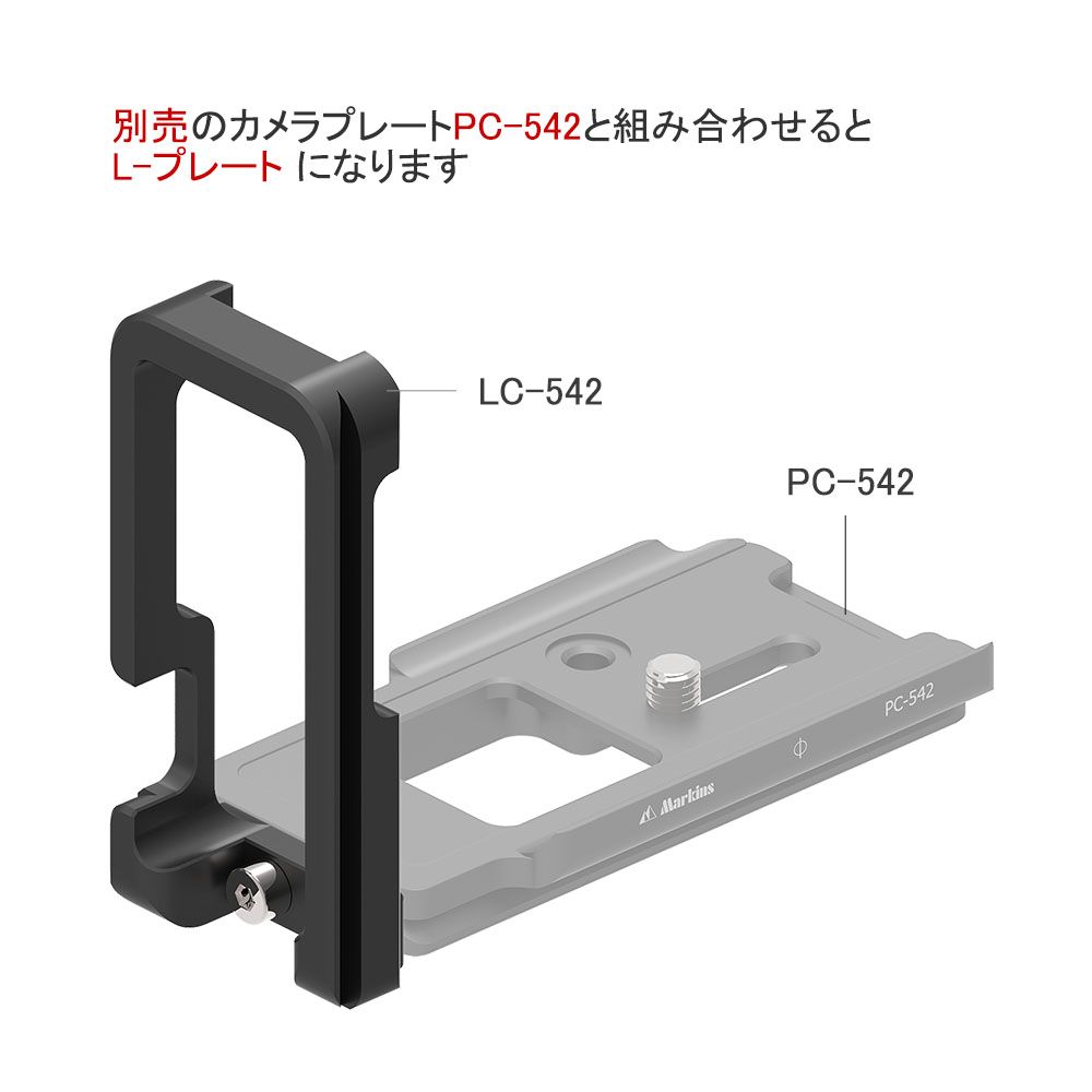 カメラプレート PC-542 と組み合わせることにより、縦位置撮影に素早く変更できる L-プレート(L型ブラケット)としてご使用になれます。