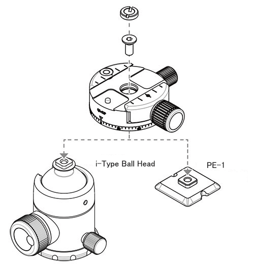 It can be mounted directly on our new i-Type Q-Balls replacing the existing clamp with M6 screw. Or, it can be mounted on top of the existing Arca Swiss type clamp using the PE-1 Adapter that comes together as kit.