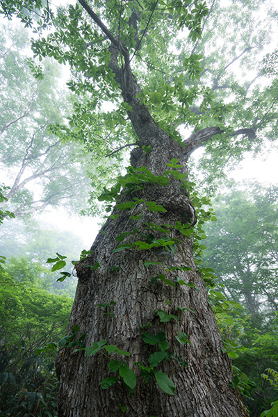 ブナ林で巨木を見上げての撮影です。極端なローアングルやハイアングルではカメラのバランスが不安定になり、自由雲台では不安になることがありますが、マーキンスの自由雲台は確実な固定力で撮影をサポートしてくれます。